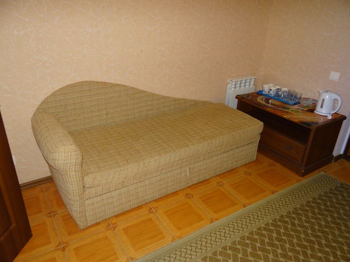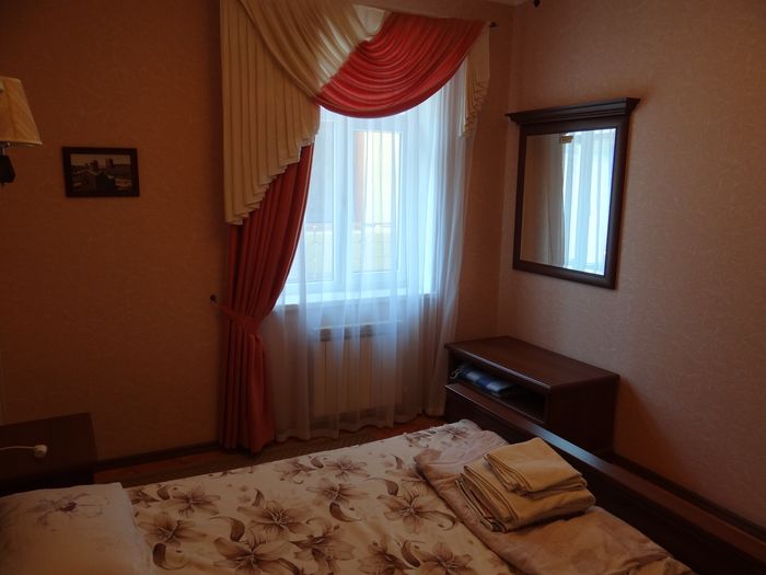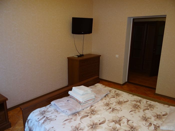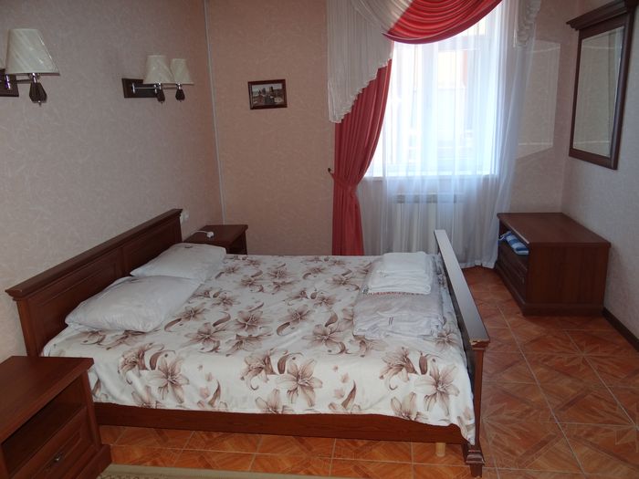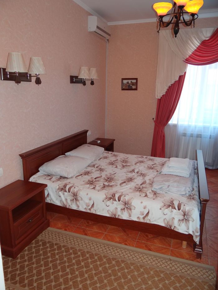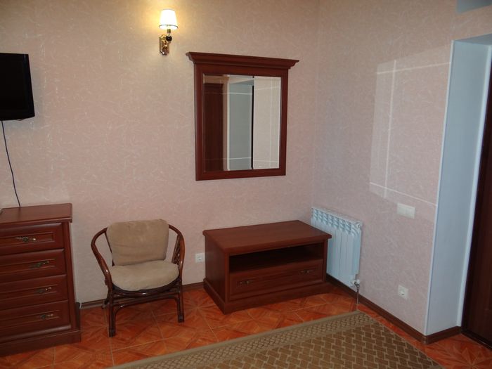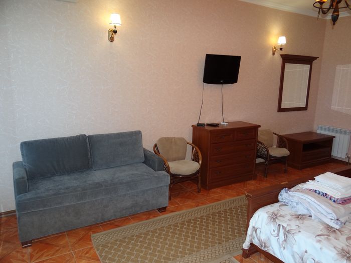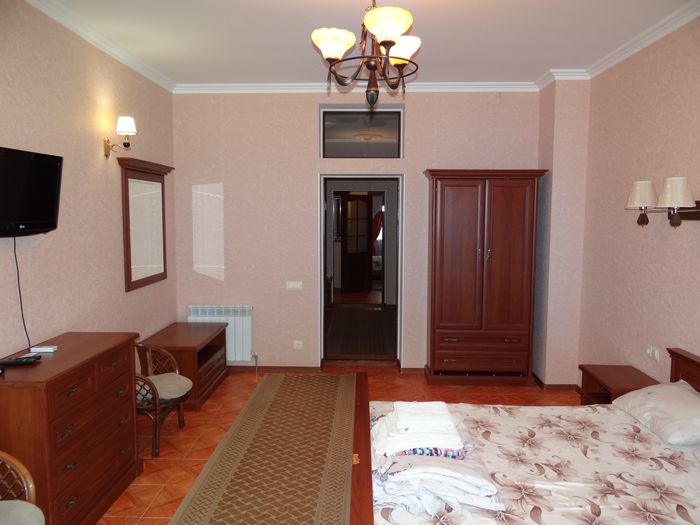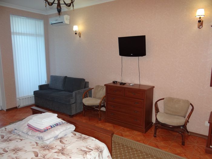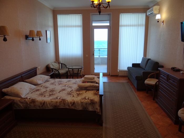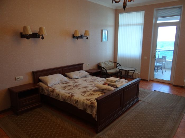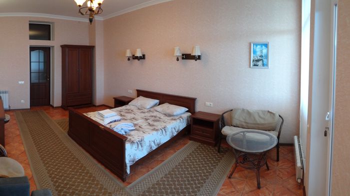 Двухкомнатный номер с балконом-террасой  Номер с видом на феодосийский залив, с балконом-террасой  и выходом на пляж Вместимость:  до 4-ех человек.    В каждой комнате номера:  - двухспальная кровать,  - телевизор, -  кондиционер.   - Раскладной диван.  -  Платяной шкаф, столик  с 2-мя креслами,  - дополнительная диван-кровать для ребенка,  - холодильник.   Санузел  оборудован  душевой кабинкой.